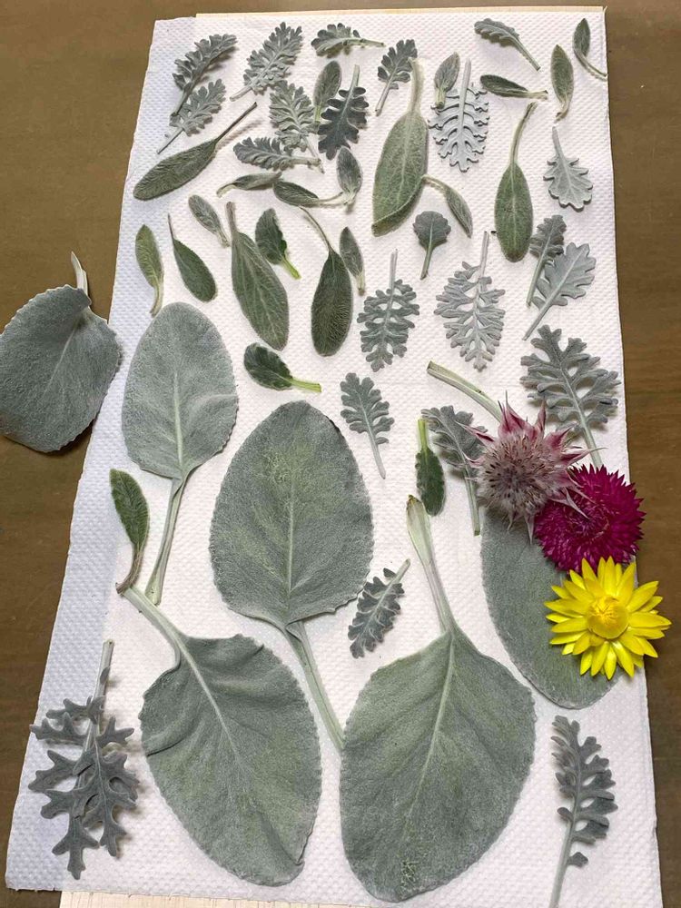 シロタエギク、エンジェルウイングス、ラムズイヤーをそのままぶら下げて乾燥させると丸まってくるのでキッチンペーパーにしばらく挟んで型付けしそのあとぶら下げたりそのままペーパーの上で乾かしたりしています。
