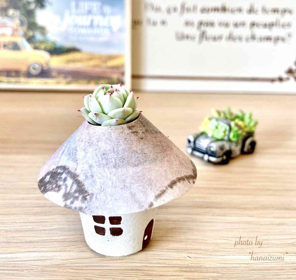 1号鉢に白いペイントをして窓と扉を茶色で付け足して、屋根は柔らかいプラスチック素材で作ってデコパージュでコーティングしてます🏠😆🎶