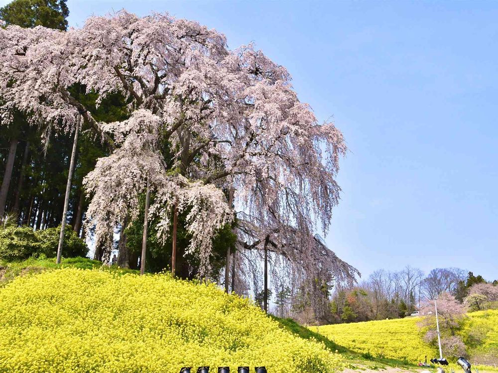 滝桜から北に上ると、R459沿いに「合戦場のしだれ桜」があります。立派な一本桜で、菜の花とのコラボが素晴らしい。めちゃ混みということもないので、オススメ。