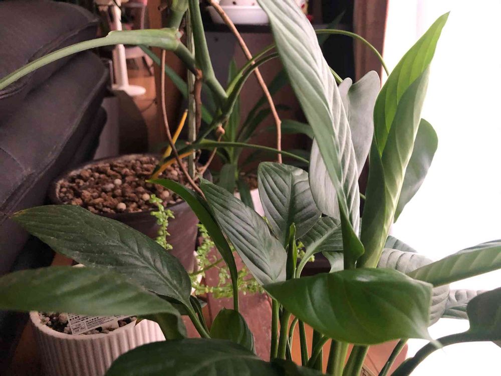 スパティフィラムも新葉がクルクル巻いて開き始めました。☺️