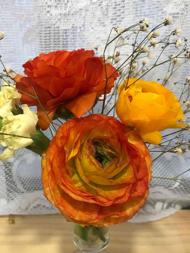 昨晩の雨で花びらが1枚2枚散りかけた庭のラナンキュラス🌼