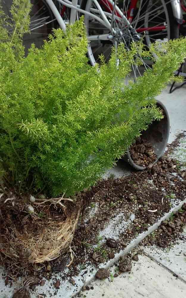 先日、アスパラガスメイリーを植え替えしました。鉢を転がし菜箸で廻りをつつきながら解すこと40分