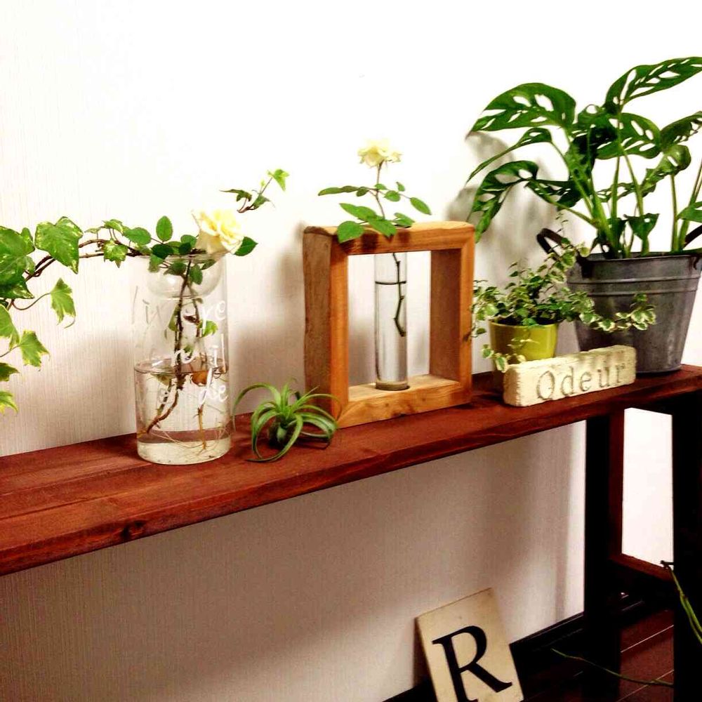 私の大好きな方からいただいた一輪挿しです。ウッド&植物の組み合わせが好きで他のポットとのアンバランスなバランス感を考えつつ並べてみました。
