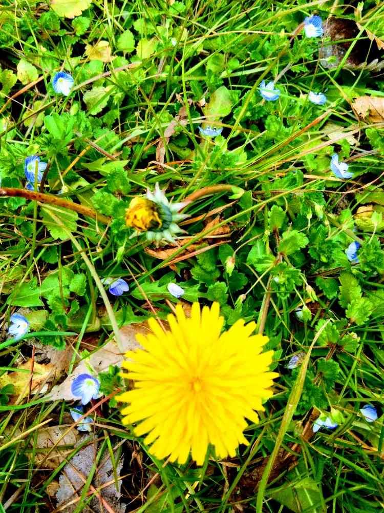 出勤の通り道に、柵越しにオオイヌノフグリとタンポポが、咲いていました。