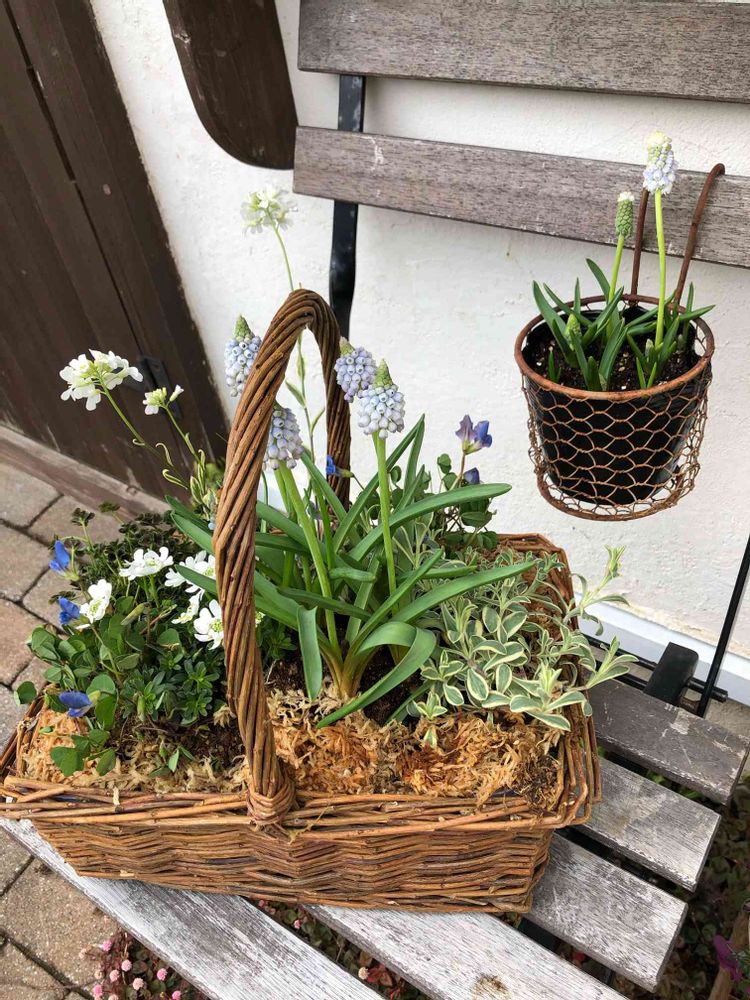 さん...♪*゚こんばんは🌙*゚バスケットの寄せ植え可愛いですよね🌱🌱🌱︎💕︎ムスカリのグラデーションもステキですよね💜