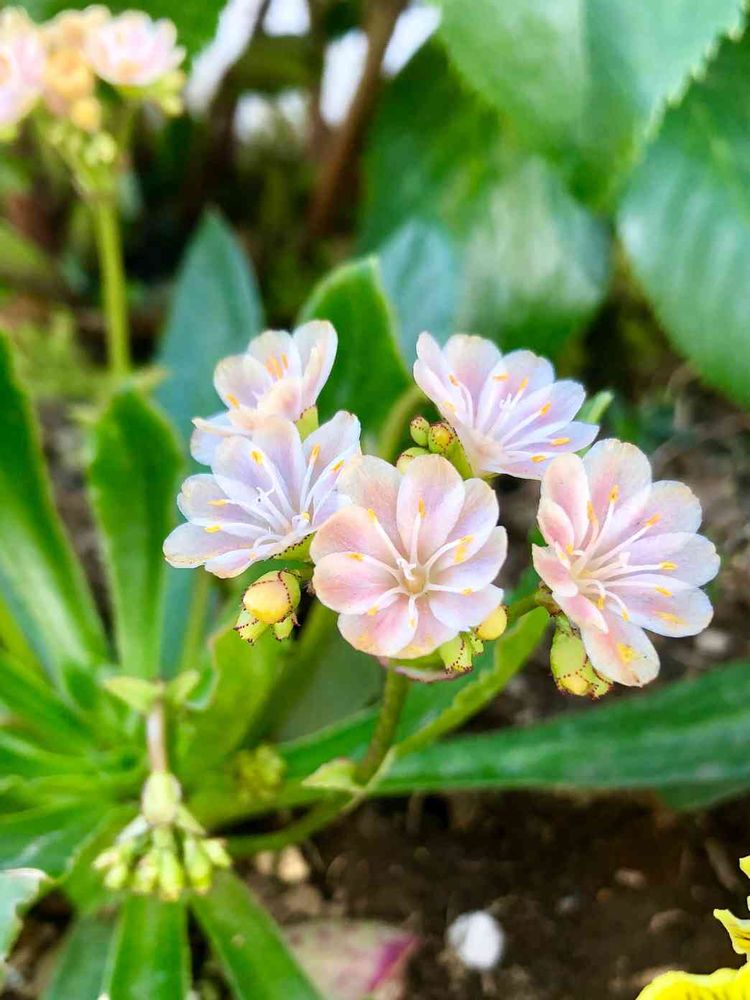 優しく、透き通るような色の、多数の薄い花びらが繊細です。手厚く迎えるようなのかとドキドキしながら…けれど地植え🌱の庭のレウィシアです。