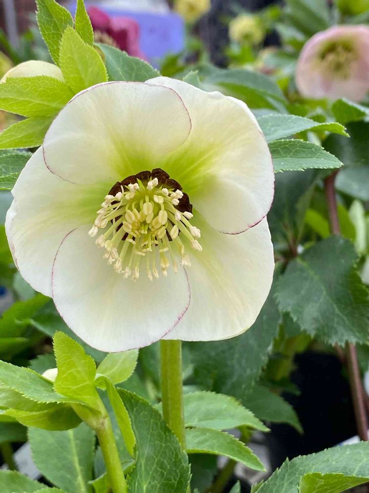 縁取りに紫色の装いをした、清純な感じを見せるクリスマスローズの華やぎ素敵です