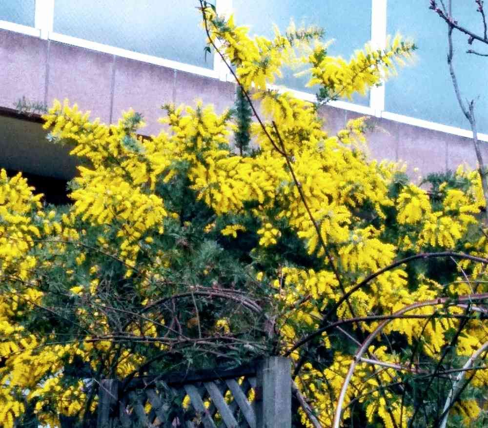 散策中にミモザがお庭に植えられて、満開に成っているお宅を、見つけました。