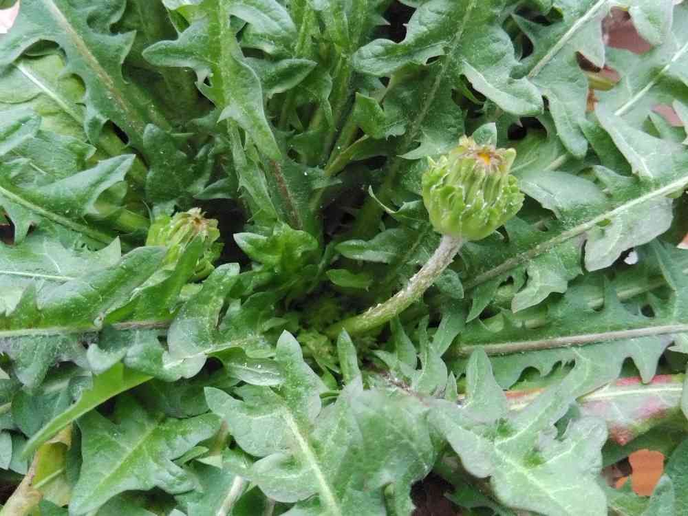 カントウタンポポのツボミの先から黄色い花びらが見え始めた。もうすぐ咲きそう