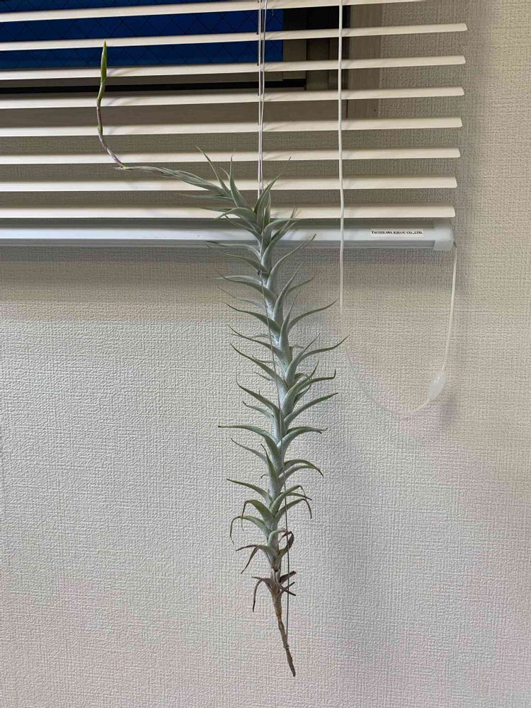 チランジア アルビダ ミノール!花芽を付けていますが、途中から90度直角に曲がり始めました。今後どうなるのでしょうか?😅そして開花後、子株はどこから出てくる??