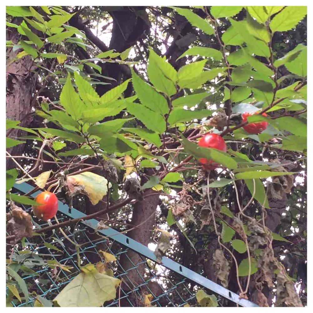 カラスウリかなぁ。見上げるこの場所の赤い実に気づくひと、どのくらいいるんだろう。