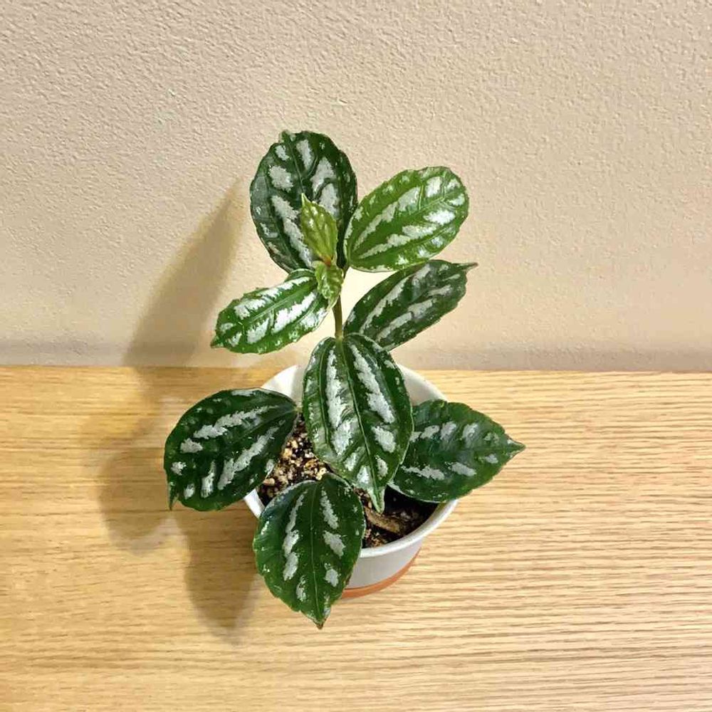 アルミナム・プラント、正式名称ピレア・カルディエレイ。ピレア・ぺぺと同じ家族のようですが、それぞれ違う面白さがあります。カルディエレイはまるでペイントしたような味のある柄と、アルミナムの名の通りのギラギラの光沢が特徴です。