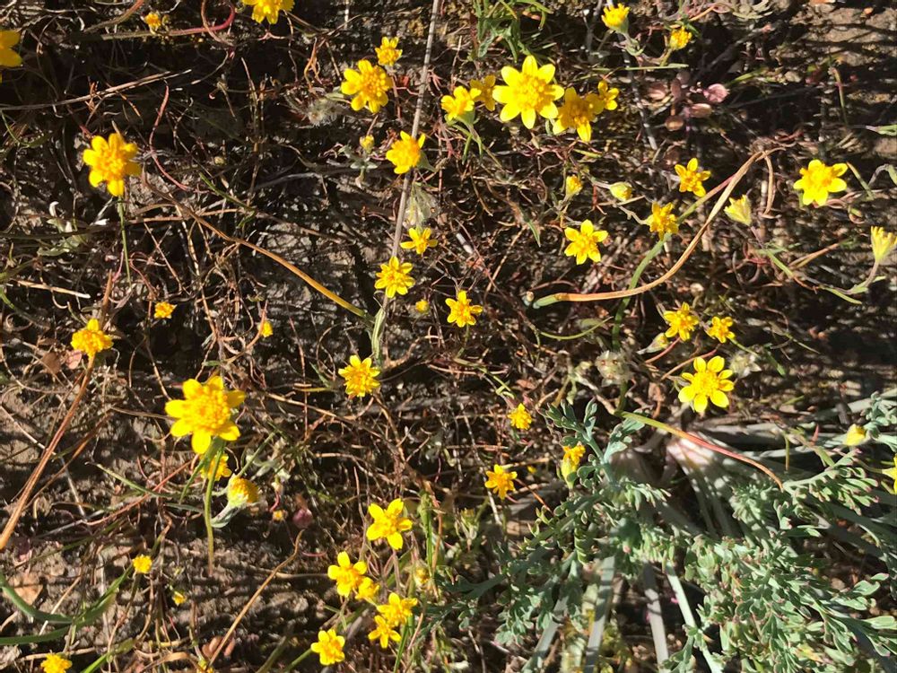 Santa Teresa park にて。トレイル脇に直径1センチあるかないかの小さな黄色い花の群生を見つけました。デイジーの仲間の California goldfields という植物でした。