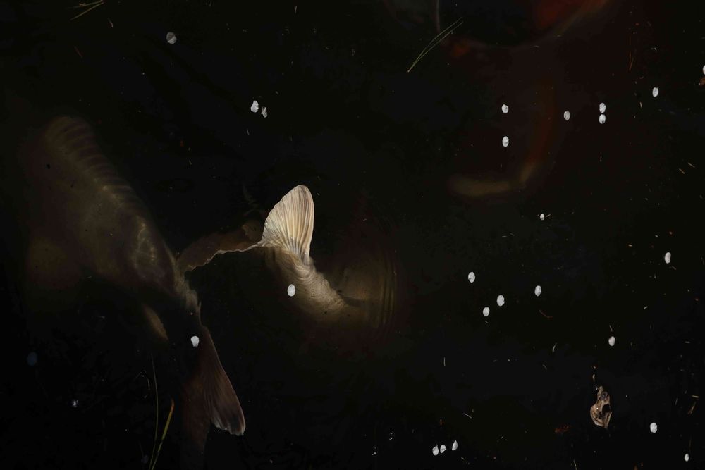 白い二尾の鯉の戯れ&美しい二つの尾鰭 >
