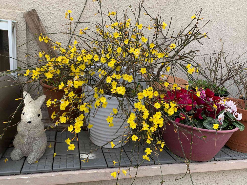 先ずは、花木は。真っ黄に映えた、つる性低木のオウバイ<黄梅>(モクセイ科)と、その右に赤紫のシクラメンが鉢に、そして、その左にはガラス細工だろうか、ウサギちゃんが、道ゆく私を和ませてくれた。そして、心地よく私は、歩を先に進めた。
