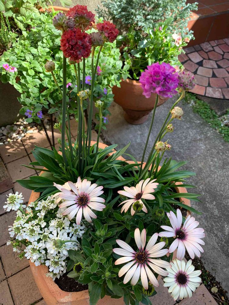 アルメリア、イベリス、オステオスペルマムの寄せ植えを作りました。