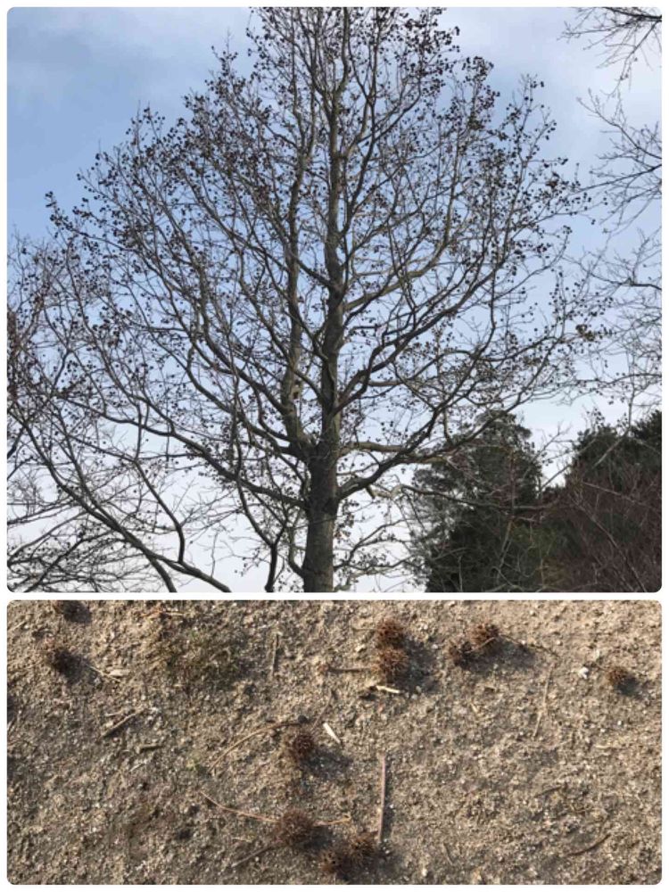 樹の真下には丸いトゲトゲきた種❓みたいなものをが沢山落ちていました何かなー🙄