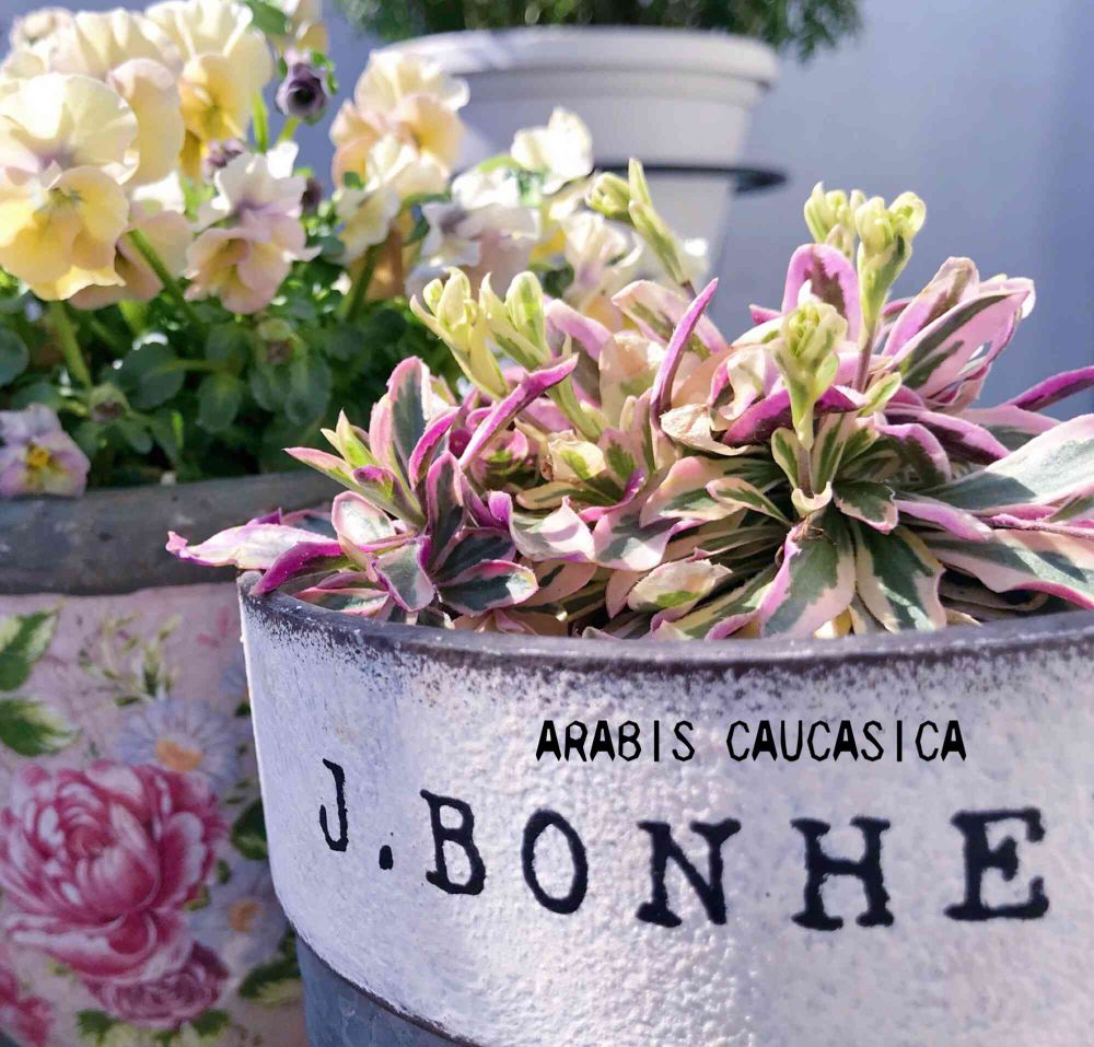 私がたまに行く千葉大の売店に大学の温室で育てた野菜や植物が売ってるのは以前紹介したのですが、そこで、この子、レアな植物として売ってました💚でも、名前の表示がフェルディナンディバリエガータとなってて、アラビスって部分が抜けてて、初め似てるけど違うのかと思ったらネットで見たら同じとわかりました😆たわいのない事を長々とすみません💦うちのは購入時からニョロニョロと花が伸びてて、たまたまあった古くさい和の素焼きの鉢に入れてたから、おしゃれ感が無く全く様子が違うようにみえたわ😅やっぱ、器大事ね😅