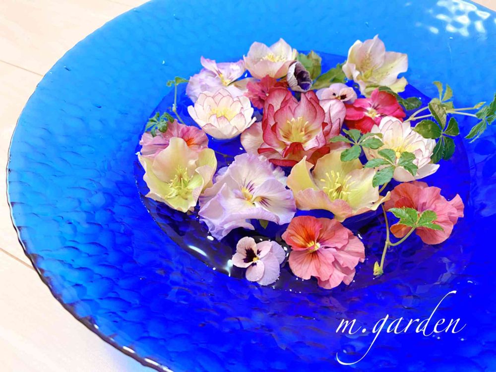 ブルーのガラスの器とお花たち引き立てあって最高ですね✨