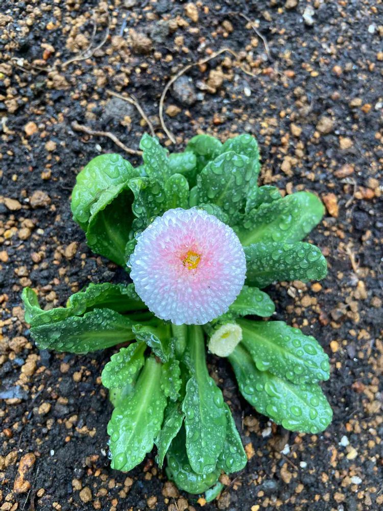 ぽったりしてかわいいので大好き。植え替えたばかりの冷たい雨だけどがんばって。