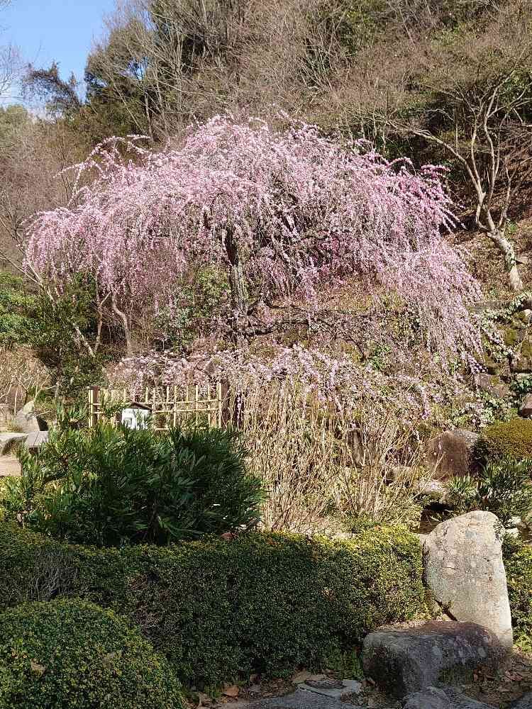 枝下梅の回りに池があるんだけど湖面が花びらでピンク色になっていたよ