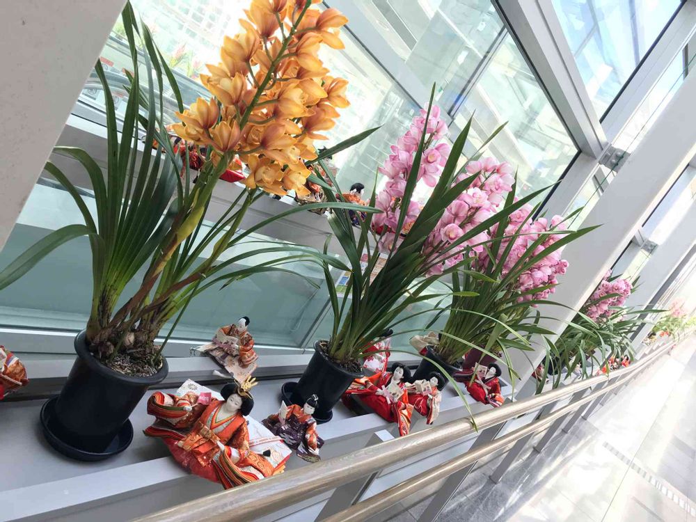 日本の空港では シンビジュームを飾り その下で 沢山の お雛様が マスクをしましょうと 呼びかけていました