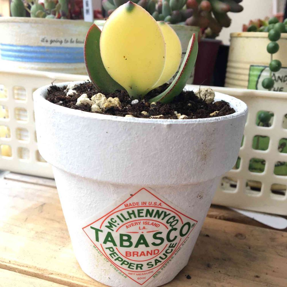 タバスコのビンからきれいにはがれたラベルで鉢はタバスコ😁🎶