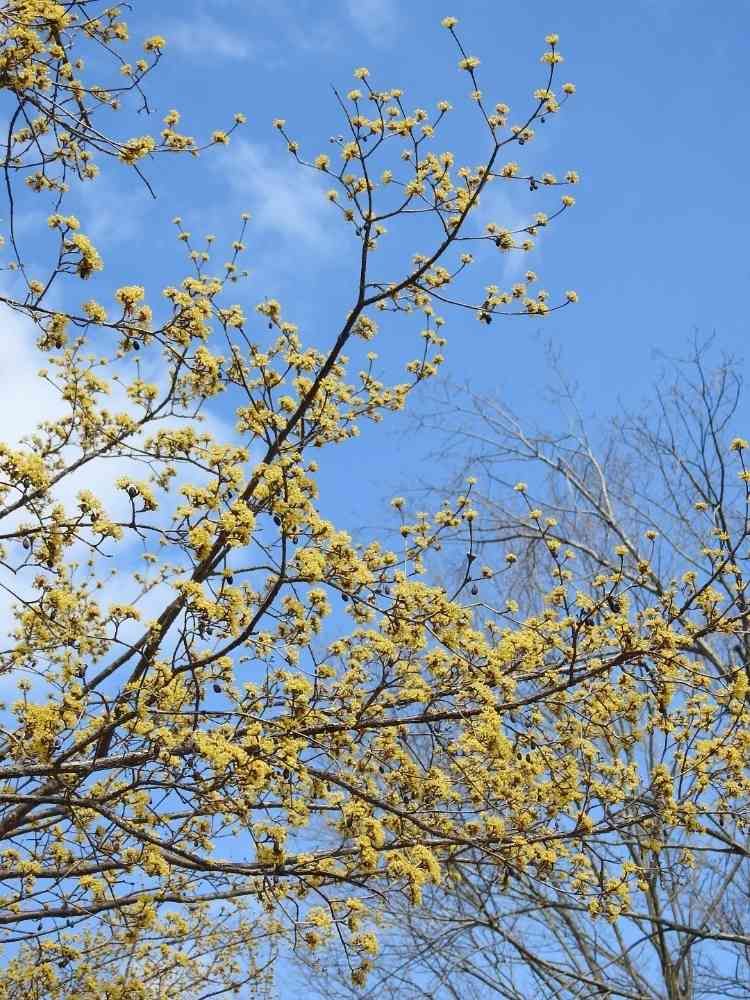 青空に映えるヒュウガミズキの鮮やかな黄色い花🌼