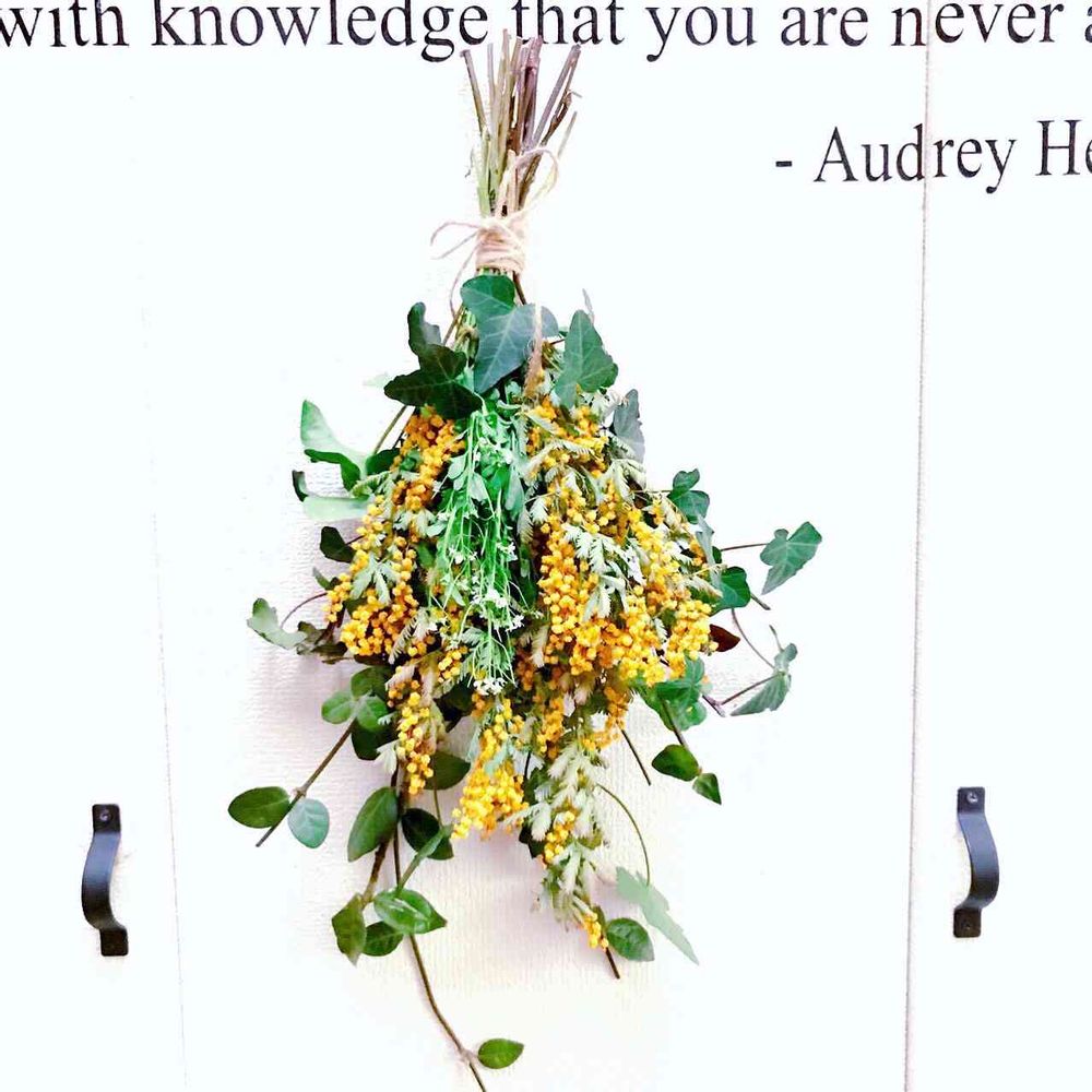 ミモザのスワッグにアイビーの葉も入ってて素敵ですね😍