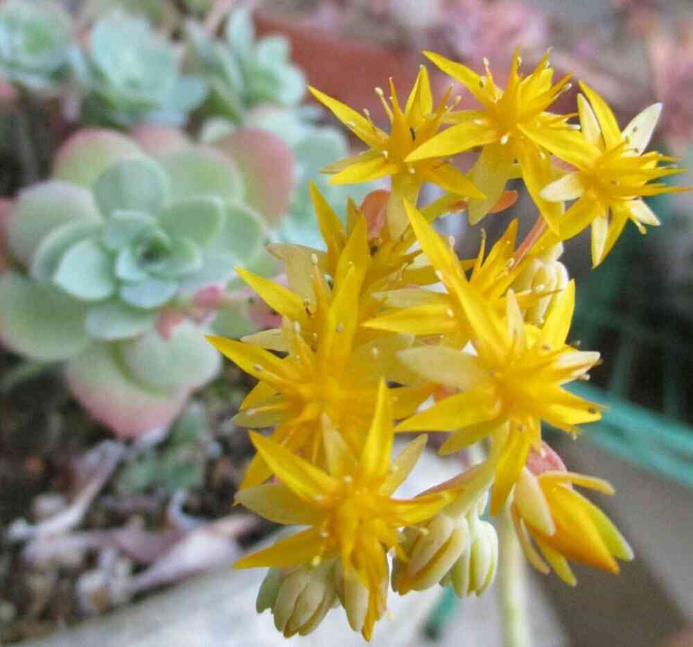 この株の面白いのは、花のないときは、アエオニウムのような葉だけど地味で、目立たない。 咲くと急に華やかになるんです。