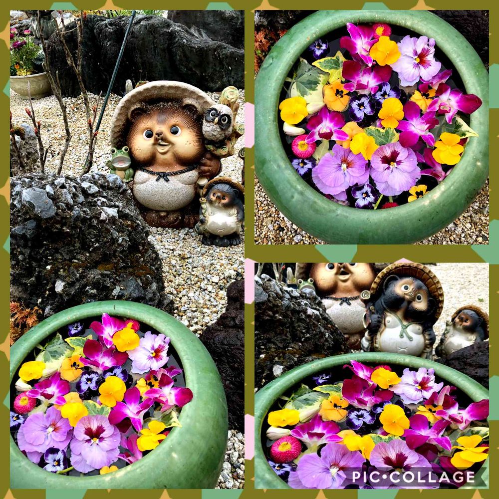 散歩から帰り庭に置いてある火鉢に水を入れ 家にあるお花を浮かべて見ました▸▸🌸