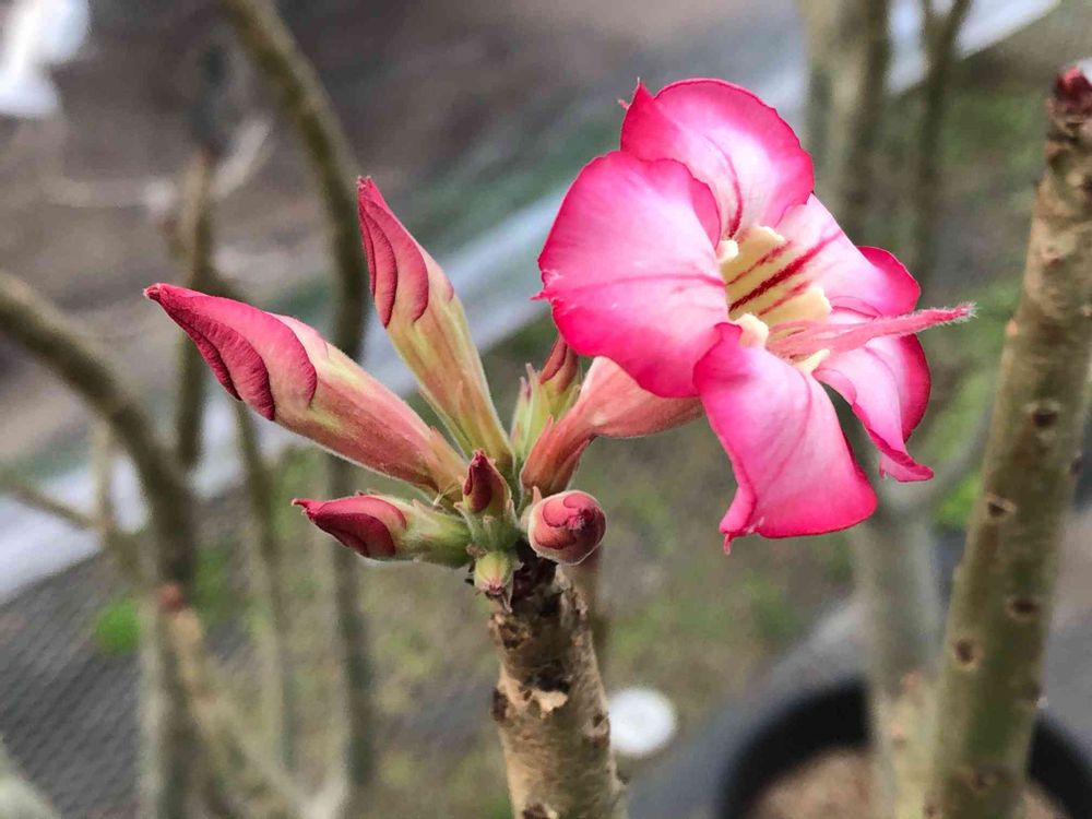タイのアデニウム 生産者のオリジナルの個体です。よく見るコーデックスのぷっくりとした株姿ではなく枝が伸びてプルメリアの様に育ちます。