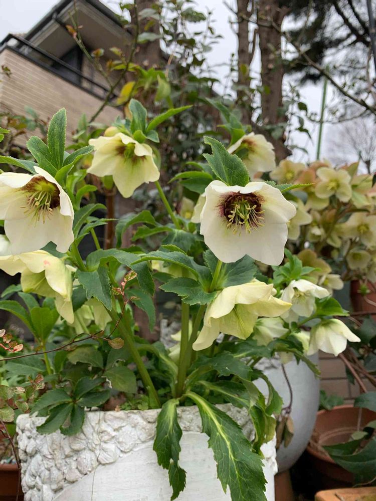 桜柄のこの鉢が気に入って、数年前に植えたクリスマスローズです🌿白の一重で、金色の蜜腺のまわりに、少しダークな色が入ってます😀後ろの鉢も同じデザインでひとまわり大きなもので、こちらにはシューティングスターが植えてあります🌿