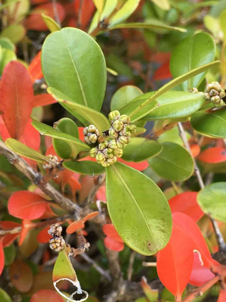 セイヨウツゲ 知らなかったのでPCで調べたら ボックスウッドで流通してますね、違いはほぼ無い、刈込に耐える事と樹高が大きくても8mまで ツゲは9mを越える事があり紅葉もします、どちらも雌雄同株で花蕾は1個づつ、違いを見つけるのは難しいですね。ツゲ投稿します。