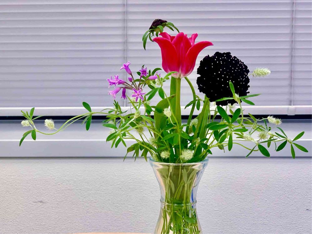 ついでに衝動買いで買ってしまった黒いスカビオサとこれまでのお花と仲良く納まりました。