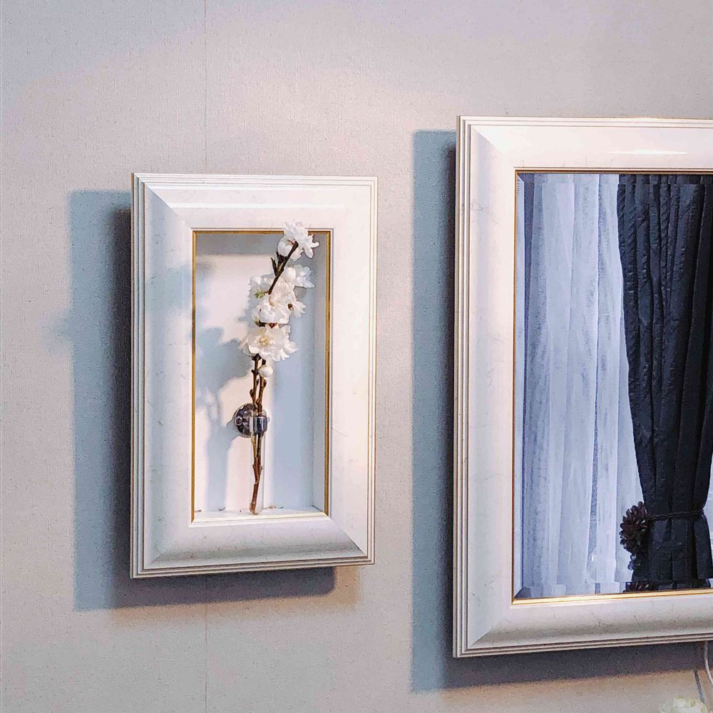 壁掛け仏壇「鏡壇ミラリエ」に今日(3/5)の誕生花の「白いモモ(桃)」を飾ってみました。