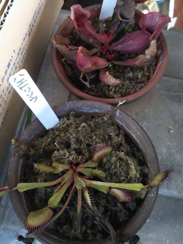 ハエトリソウとサラセニアです。日本海側暴風雨警報発令中❗️午前中の晴れ間見計らい、囲いからとってきました。初めての年越しに😀成功したみたいです。(buKkieさんのお陰です)たぶん生きてると思います。植え替えしようと思たが、駐車場の囲いの作業所は、風🌀通し良すぎる建物、今日はここに待避して、外の天気見ながらやります。