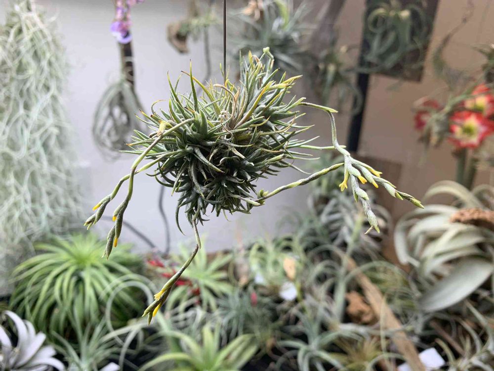 チランジア ロリアセア(クランプ)開花し始めました!黄色くて2mmくらいの花。花序が伸び始めてから数ヶ月かかりましたが、待った甲斐がありました😂