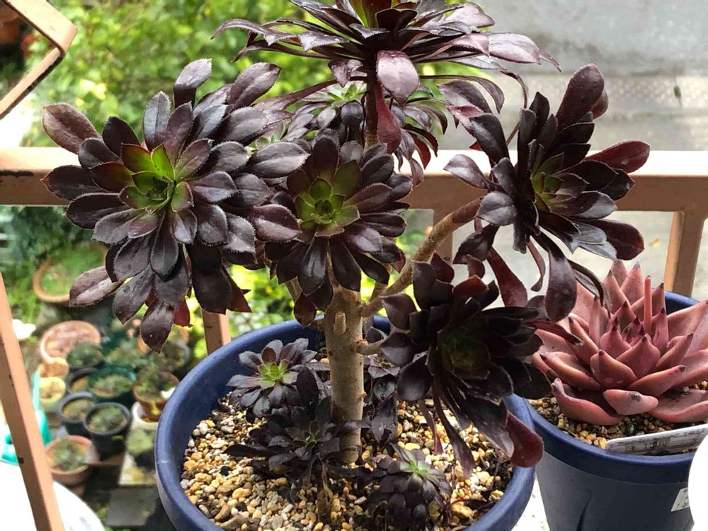 ホームセンターの暗い温室で、ヒョロヒョロだった黒法師。お日様の力で薄茶色だった葉がしっかり黒くなってきました💕