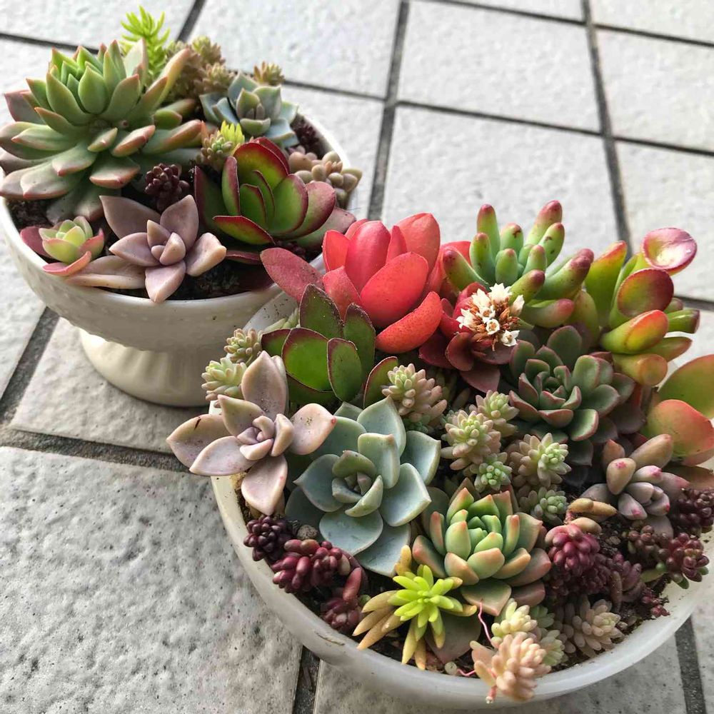 いただいた苗、最近買ったセダム色々、家にあった多肉をカットしたものを空いていた器に寄せ植えした。