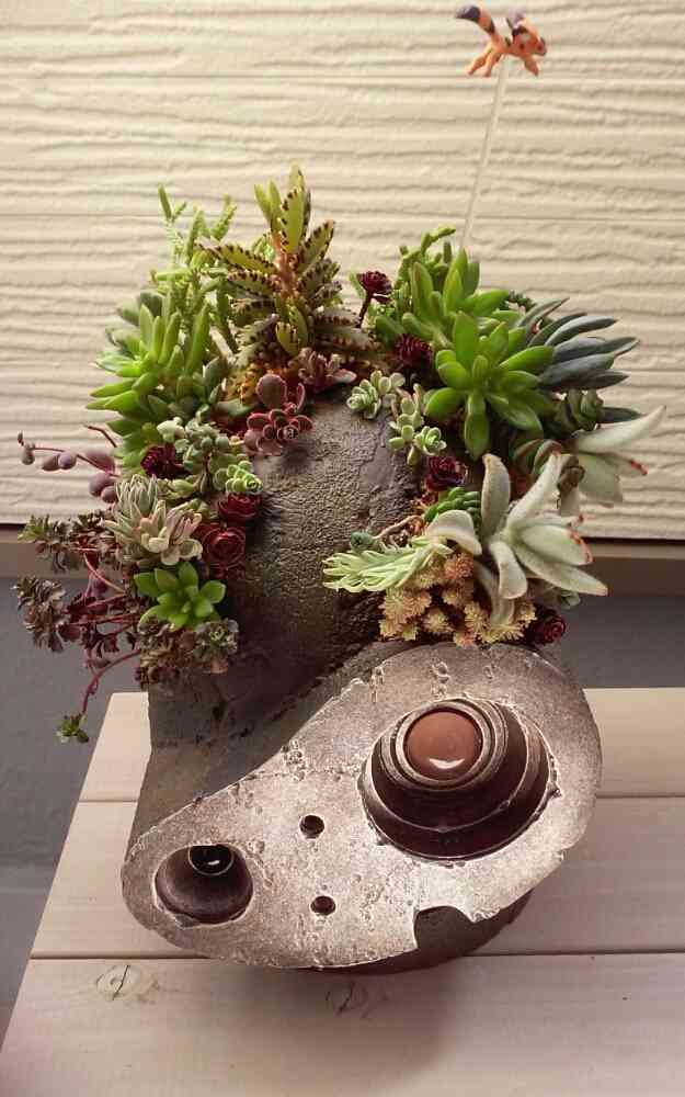 こんばんは😃🌃この鉢難しいよね~。ほんとは草丈の長い観葉植物のが良かったんだろうけど多肉植物植えてみたかった~。なので後ろにプラスチックでぐるりと土止めしてるので絶壁❗後ろ姿はお見せできません~(●^o^●)お手本⁉ダメダメ❗もっとどうにかなるはずヽ(●´ε`●)ノ👊😆🎵ガンバ❗