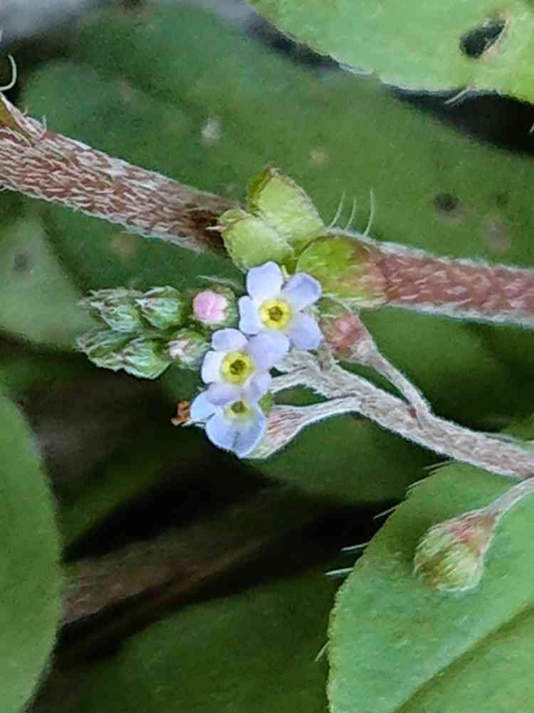 葉内花(ハナイバナ)や勿忘草(サスレナグサ)に似ている。本種は茎の先端が丸まり花の中心は黄色い。ハナイバナは茎の先端が丸まらず花の中心は白色。ワスレナグサは全体に大形で、花も直径6~9㎜で本種より大きい。