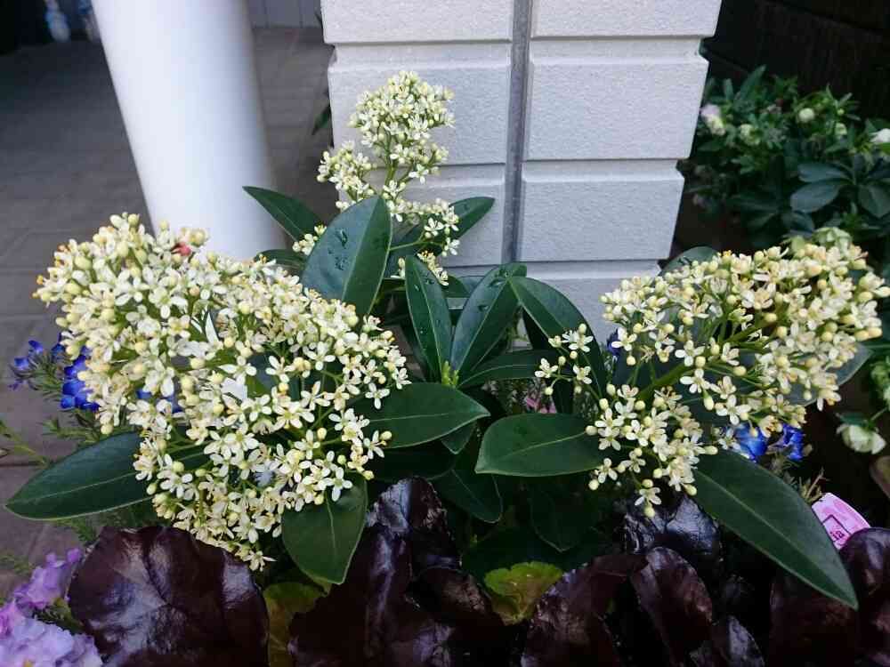 1月22日の寄せ植えにしたシキミアが満開になりました。