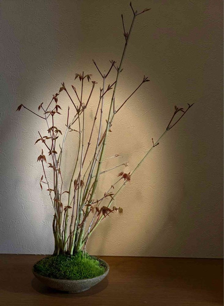 ヤマモミジの寄せ植え、新芽を吹きました🍁iPhoneのポートレート撮影機能でスタジオ照明風にしてみました。