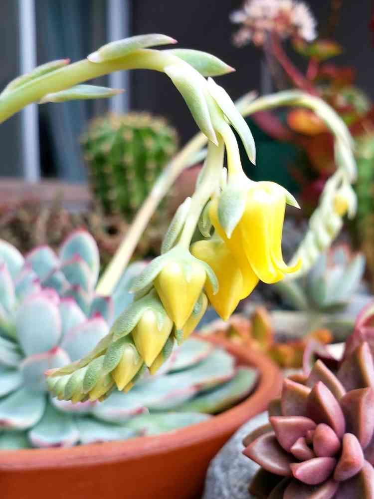 エケベリア 春うららの花が開き始めました。花茎が次々とあがってくるので早めに摘むことにします。黄色は春を呼ぶ色ですね。