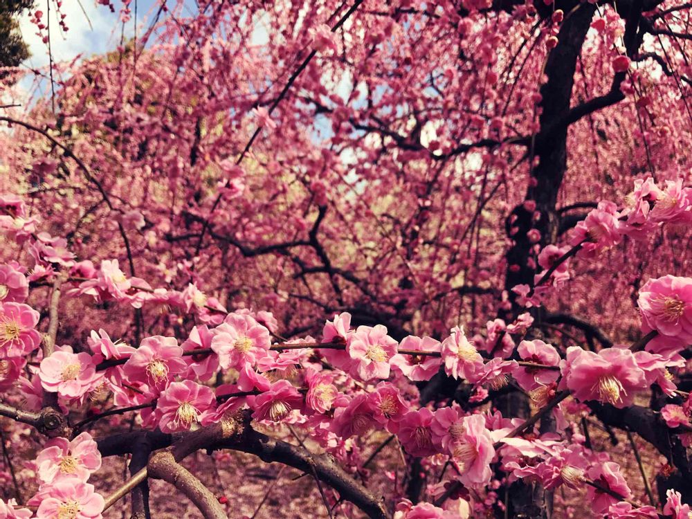 咲き誇る枝垂れ梅の庭園に春を感じます