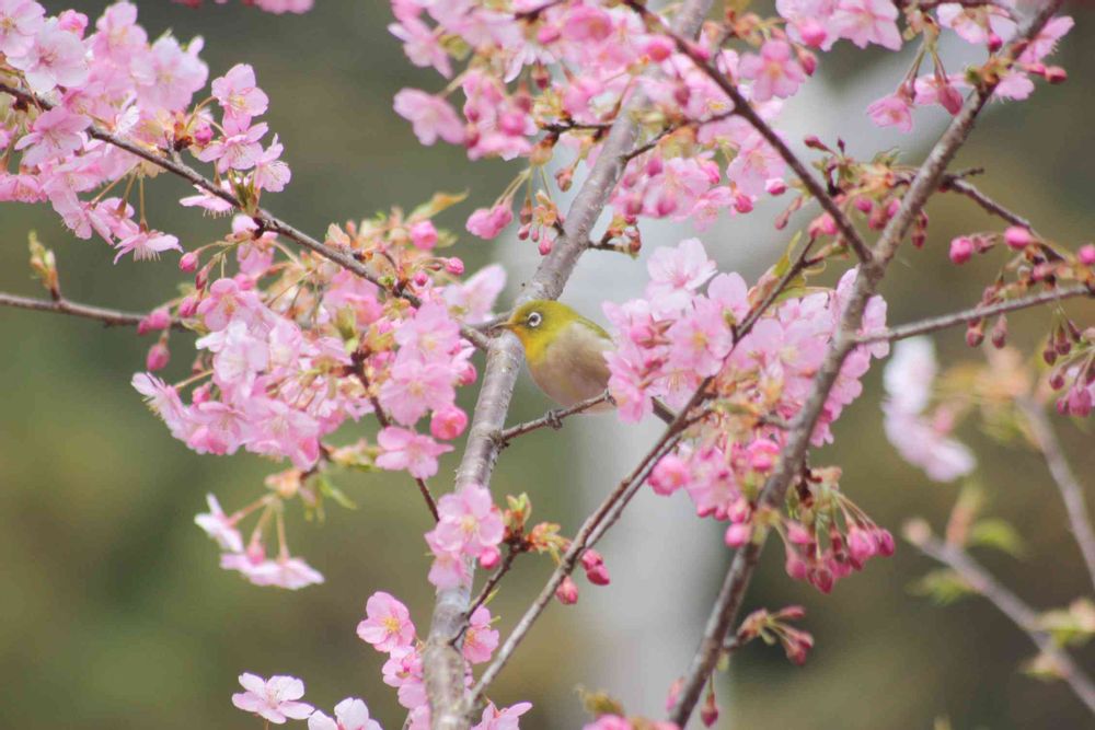 可愛いピンクの桜のお花の中のメジロちゃん ♬︎