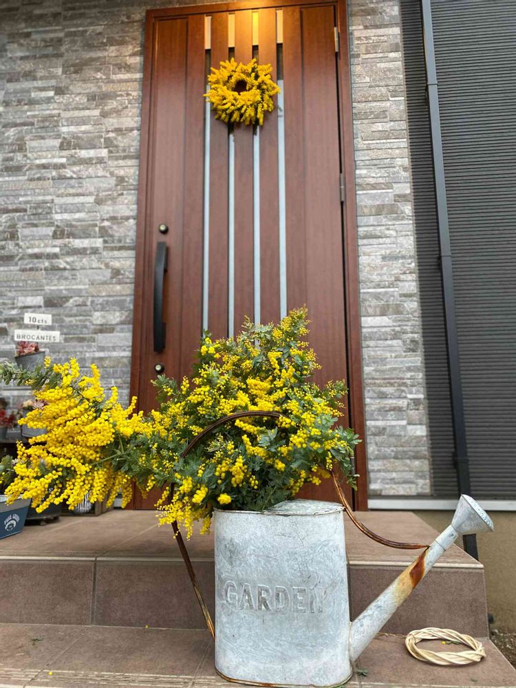 素敵な玄関!やはり、ミモザはいいですね。リースも水挿しも。