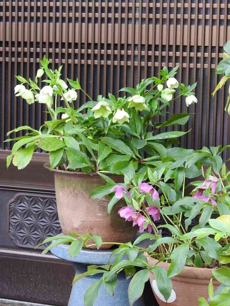 民家の玄関先の鉢植えのクリスマスローズ花🌼