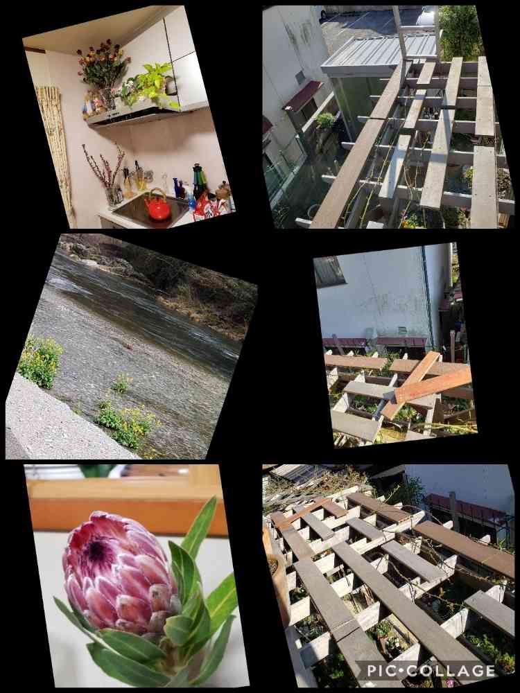 上段の左側は、2階のキッチンの妻のお気に入りのコーナーです。今日は切り花の梅を日光浴させて、そのあと、写真の通り、明日の朝までゲストとして、この場所に置くことにしました。